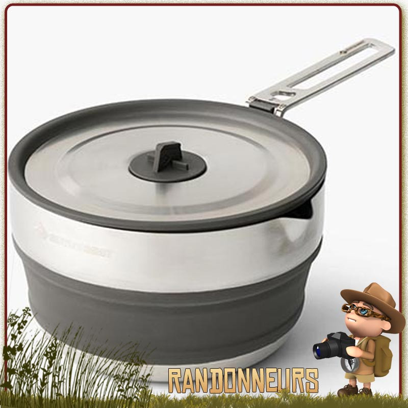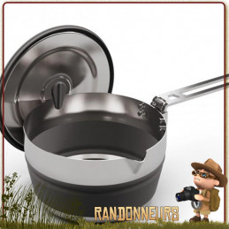 Casserole pliante Inox Detour 180 cl Sea To Summit - Casserole ultra légère pour la randonnée, avec parois repliables en acier inoxydable et silicone alimentaire résistant à la chaleur. Volume utile de 1.8 Litres. Pot équipé d'un couvercle inox. Bec verseur. Compatible avec les tables de cuisson à gaz et à induction. La poignée amovible Click-Safe facilite le transport et se verrouille en toute sécurité pour l'utilisation.