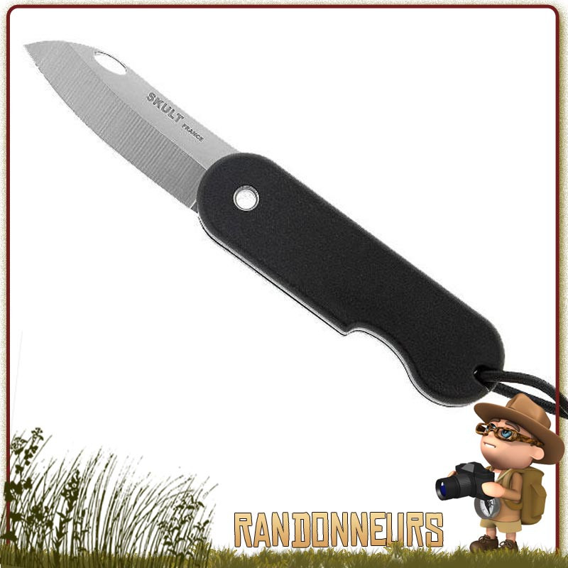 Couteau Pliant SKULT Noir- Couteau pliant SKULT de fabrication française lame 6 cm acier inox X46Cr13 sans cran, à onglet traversant et avec lentille. Manche 10 cm à base de 100% de filet de pêche recyclé. Cordon nylon noir.