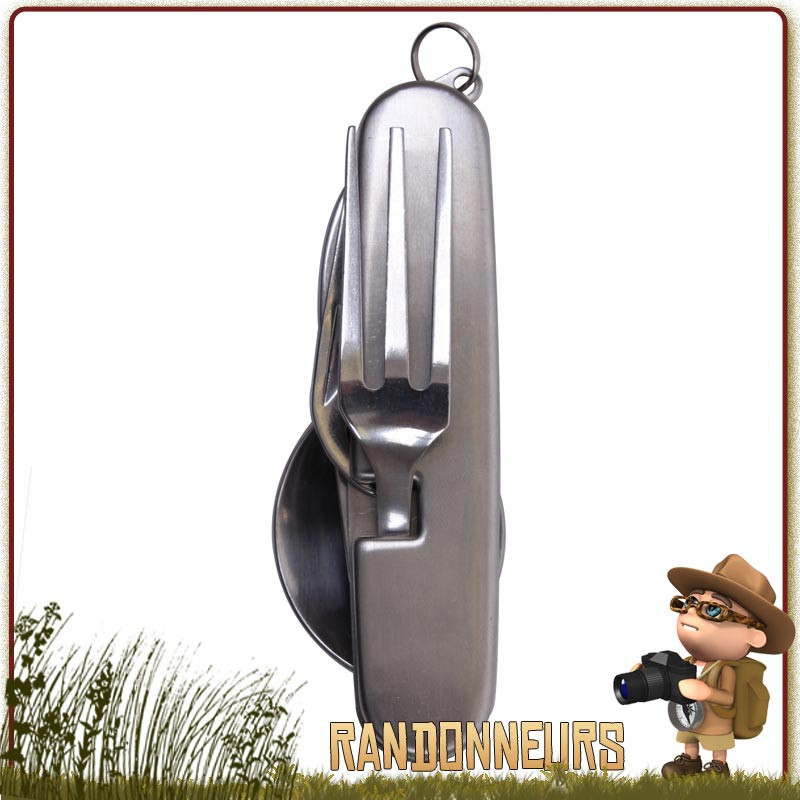 Set Couteau Couverts Pliants Inox Rothco - Set Couteau et Couverts de Camping. Lame et manche acier inox. Ensemble compact et robuste composé d'un couteau, d'une fourchette et d'une cuillère détachables en deux parties. Ouvre-boîte et décapsuleur. Un set de couverts de camping inox pour les randonneurs.