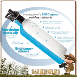 La gourde Inox du fabricant 360 Degrés est conçue en inox 18/8 qui assure une grande robustesse et un nettoyage facile. Large goulot avec bouchon pas de vis permettant un remplissage rapide, comme l'insertion de glaçons par exemple. Gourde de randonnée plutôt légère à utiliser en trek comme au quotidien.