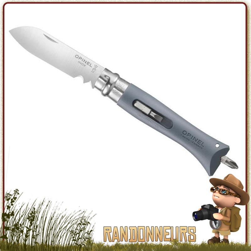 Couteau 9VRI Bricolage Gris Opinel - Couteau fermant Opinelde bricolage multifonctions OPINEL n°9 VRI, lame inox avec coupe-fil et dénude fil électrique, manche 12 cm fibre de verre gris avec embout plat 4 mm et tournevis cruciforme 3,5 à 5 mm, virole tournante
