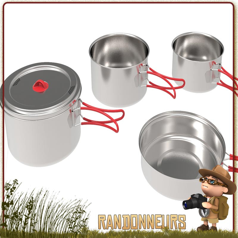 SET POPOTE BIVOUAC INOX BIWAK 3 RELAGS - Ensemble complet de Popote Inox Biwak 3 Relags pour la randonnée et le camping, pour 2 à 4 personnes. Set Popote Inox avec trois casseroles, couvercle poêle, pince preneuse. Robuste et compacte, popote inox idéale pour votre sac dos rando bushcraft nature
