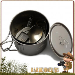 Combinaison parfaite entre un mini réchaud alcool solide, un pot de 550ml, un pare-vent et un cuillère spork titane pliante, un atout pour le trek et la randonnée